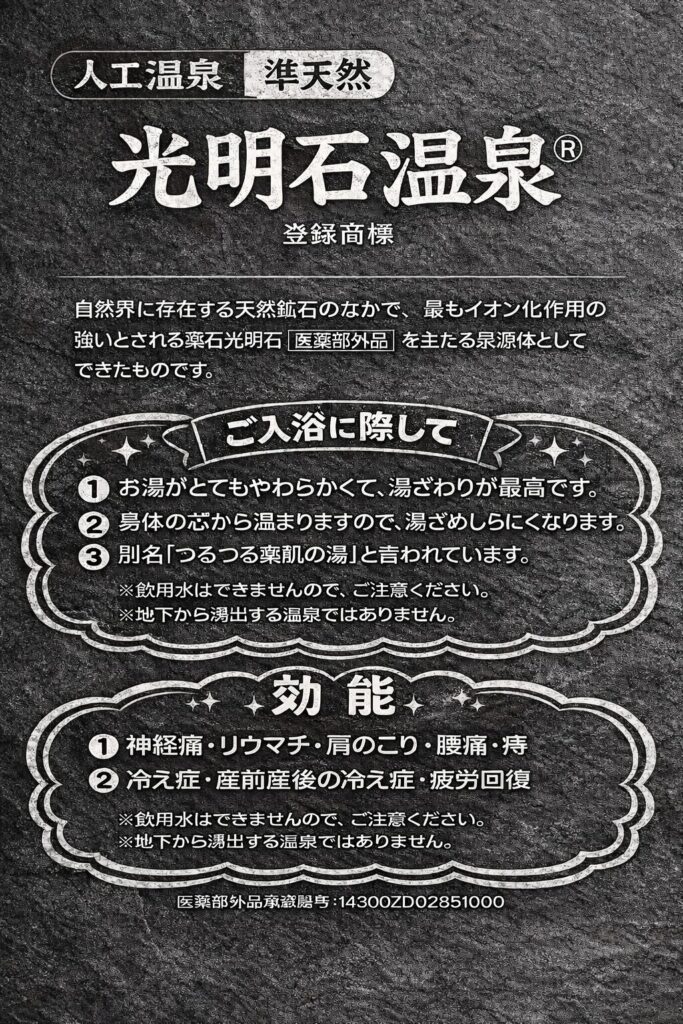 光明石は、天然鉱石由来の成分を活かし、お湯そのもののやわらかさと、包み込まれるような入浴感を追求した人工温泉。